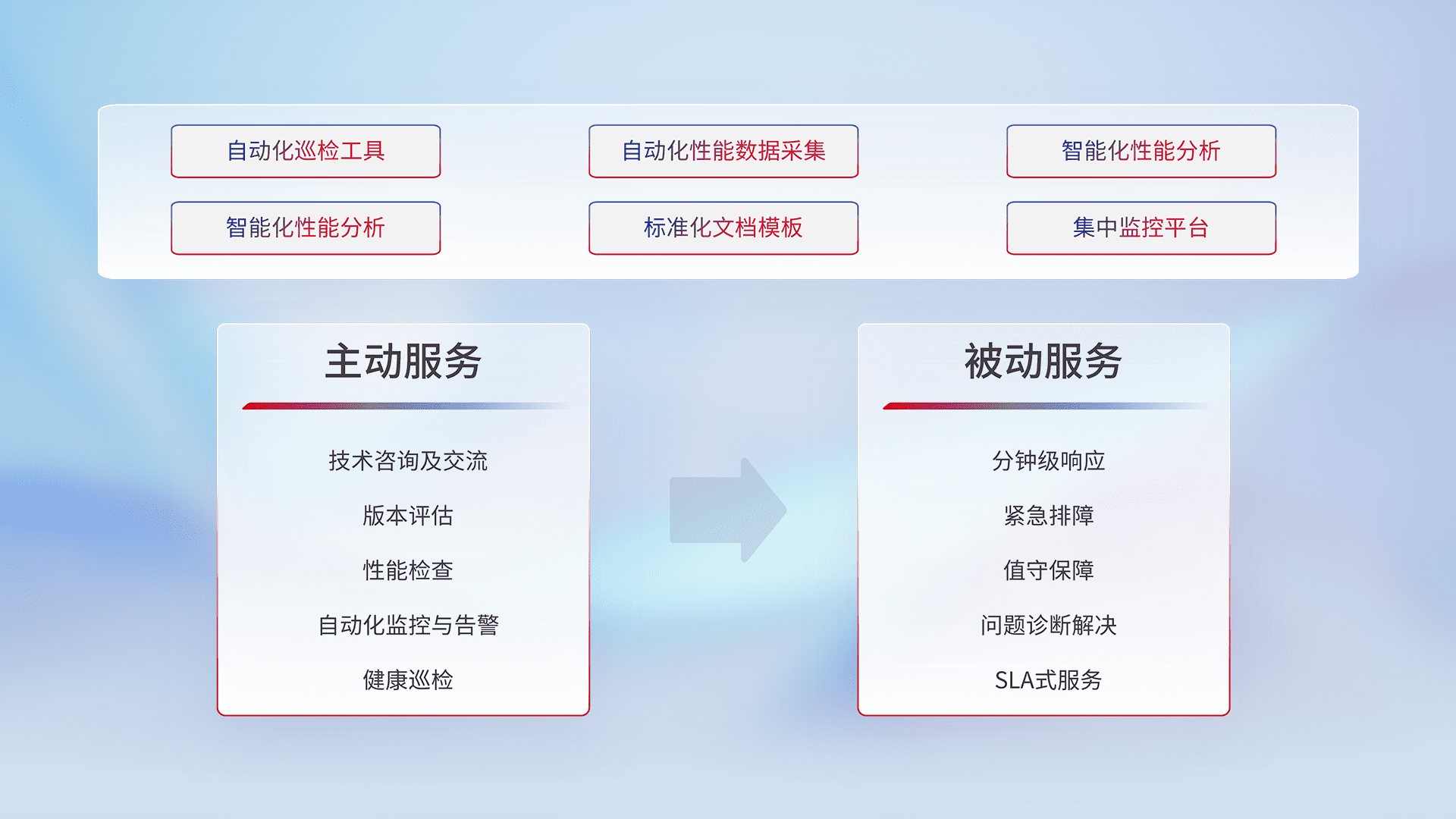 智能化工具和标准化文档,,保障服务质量,,,提供主动服务(包含技术咨询、、版本评估、、性能检查、、、、自动化监控与告警、、、、健康巡检)和被动服务包含(分钟级响应、、、紧急排障、、、、值守保障、、问题诊断解决、、、、SLA服务)。。