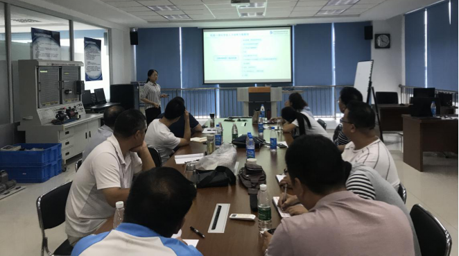 7月12日,,结合之前理论讲座和企业考察实践内容,,,天坤尊龙时凯教育机电一体化专家培训师黄玉洁为参培老师讲解德国双元制教学理念下的机电一体化专业如何进行教学实施。。。