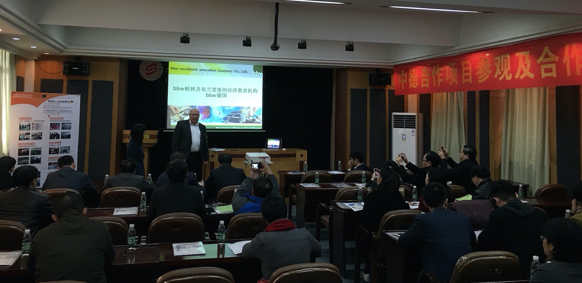 上午9:00活动正式开始,,,首先由德国bbw教育集团中国区负责人Bodo Teubert先生致欢迎辞,,,欢迎各位院校领导的到来,,,同时Bodo Teubert先生也向大家详细介绍了德国bbw教育集团的情况。。。德国bbw教育集团是柏林及勃兰登堡州最大的教育集团,,,在德国柏林及勃兰登堡州拥有26所职业培训中心及多家学习型工厂,,1所职业教育学院以及1所柏林及勃兰登堡州最大的私立大学,,,拥有近1200名员工。。。。业务范围涵盖职业培训到学历教育,,涉及各类专业。。。也是德国柏林及勃兰登堡州企业联合会下属的教育集团,,拥有强大企业资源、、政府资源以及高标准职业教育水准,,为该地区超过1800家企业提供员工培训服务。。。。